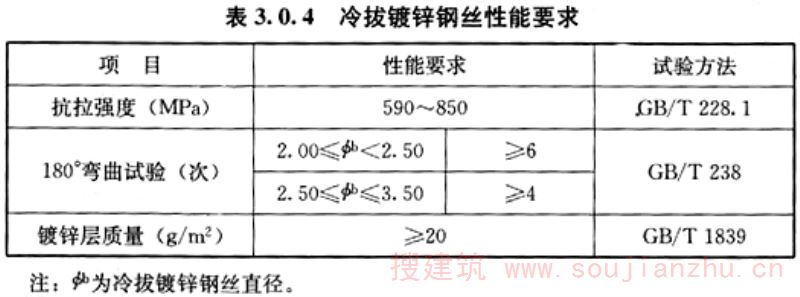3.0.4 CS板钢丝网及斜插丝应采用冷拔镀锌钢丝,冷拔镀锌钢丝性能要求应符合表3.0.4的规定;钢丝网网格宜为50mm×50mm,斜插丝的间距不应大于100mm,任何情况下钢丝直径不应小于2.00mm。