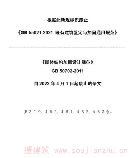 现批准《砌体结构加固设计规范》为国家标准,编号为GB 50702-2011,自2012年8月1日起实施。其中,第3.1.9、4.2.3、4.3.6、4.4.3、4.5.2、4.5.3、4.5. 5、4.6.1、4.6.2、4.6.3、4.7.5、4. 7.7、9.1.7、10.1.4条为强制性条文,必须严格执行。