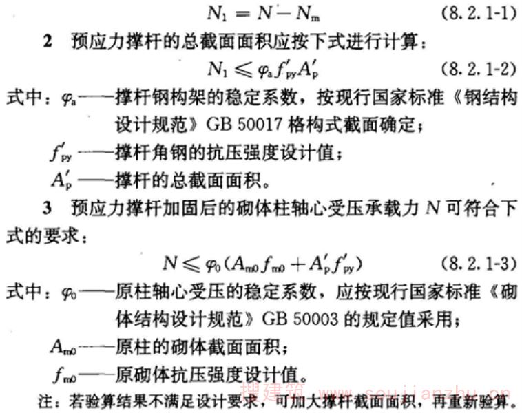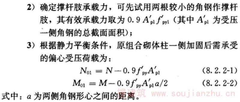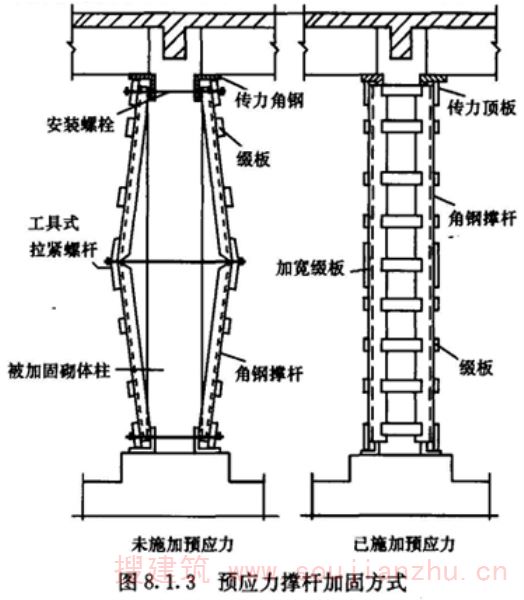 通过收紧横向螺杆装置,对带切口、且有弯折外形的两对角钢撑杆施加预压力,以将砌体柱所承受的荷载卸给撑杆的加固法。
