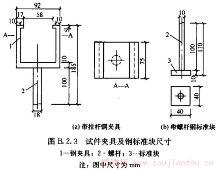 4 钢标准块(图B.2.3b)宜用45号碳钢制作;其中心应车有安装Ф10螺杆用的螺孔。标准块与加固材料粘合的表面应经喷砂或其他机械方法的糙化处理;糙化程度应以喷砂效果为准。标准块可重复使用,但重复使用前应完全清除粘合面上的粘结材料层和污迹,并重新进行表面处理。