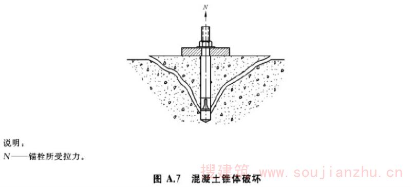 在拉力作用下,锚固作用区内形成以锚栓为轴心的混凝土锥形的破坏形式。参见附录A图A.7。