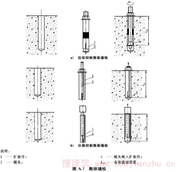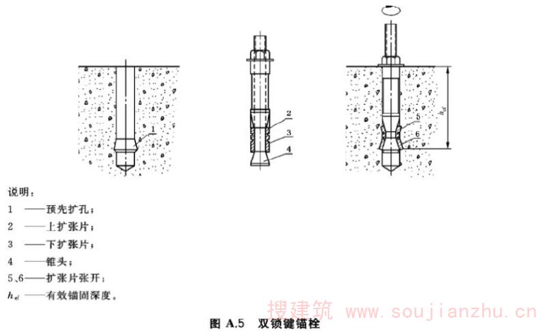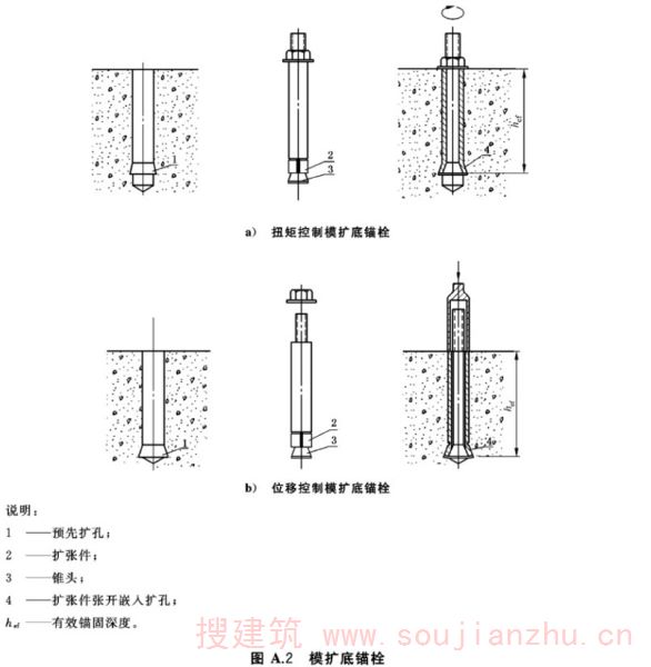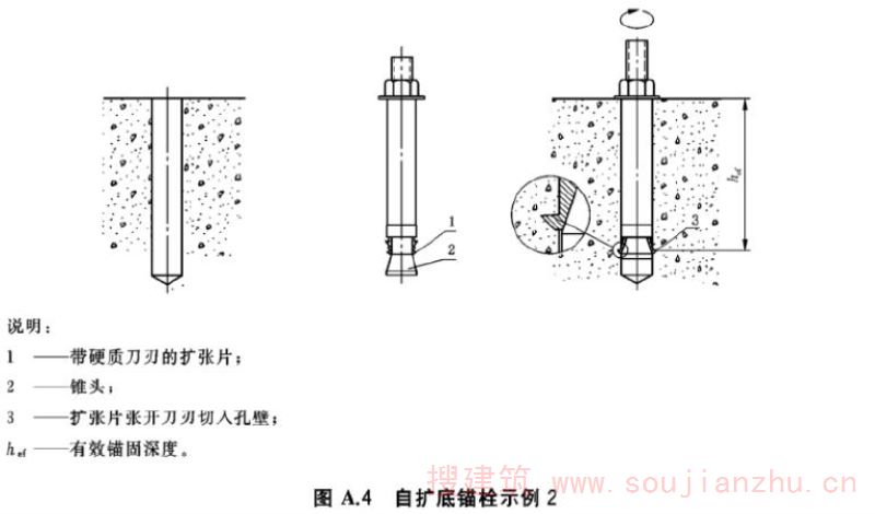 锚栓扩张件上带有硬质刀刃,安装锚栓的同时完成扩孔和扩张件嵌入的扩底锚栓。参见附录A图A.3、图A.4。