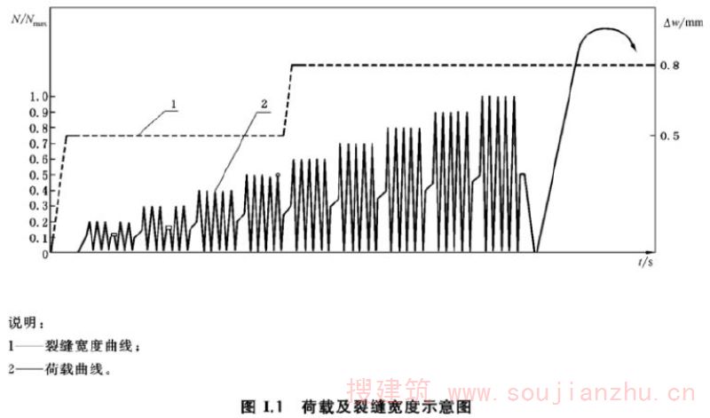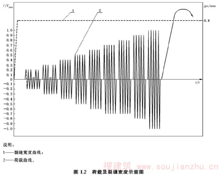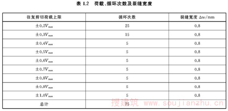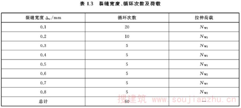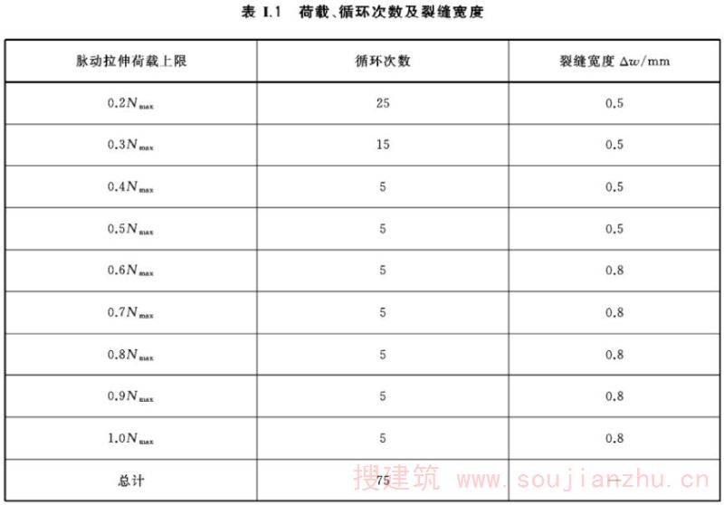 I.3.2 对裂缝两侧混凝土施加不超过截面抗压强度15%的压力,使裂缝闭合后初始宽度不大于0.05mm,控制裂缝如图I.3变幅往复开合,频率不大于0.5Hz,裂缝宽度、循环次数及拉伸荷载应符合表I.3的规定。