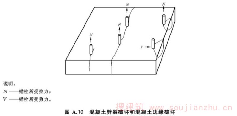 在拉力作用下,馄凝土边缘形成半锥形的破坏形式;或在剪力作用下,混凝土边缘沿剪力方向形成半锥形的破坏形式。参见附录A图A.10。
