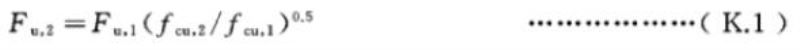 K.1 混凝土抗压强度为20MPa~70MPa时,混凝土锥体破坏的承载力值按式(K.1)进行归一化,将混凝土抗压强度为? cu,1 的锚栓承载力实测值,换算为混凝土抗压强度为? cu,2 的锚栓承载力。当锚栓拔出破坏时,式(K.1)可作为近似换算公式: