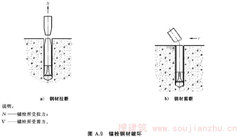 在拉力作用下,锚栓向混凝土表面滑移,最终锚栓整体或部分拔出,或在较浅的位置形成类似混凝土锥形的破坏形式。参见附录A图A.8。
