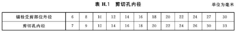 H.2.5 剪切板厚度不小于锚栓公称直径,剪切孔边缘应倒半径0.4mm圆角,剪切孔内径与锚栓受剪部位外径配台应符合表H.1要求。