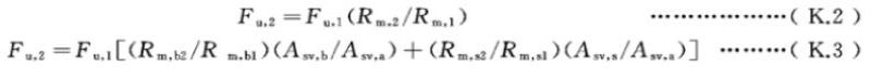 K.2 锚栓钢材拉伸或剪切破坏时按式(K.2)进行归一化,将抗拉强度为R m,1 的锚栓承载力实测值换算为抗拉强度为R m,2 的锚栓承载力。当锚栓剪切部位包含锚栓外套管时,则按式(K.3)换算。
