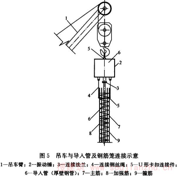 5.7.3 钢筋笼运输应保证钢筋笼平直不扭曲变形,长度大于6m的钢筋笼吊装时宜采用多点起吊。施工现场主要采取钢筋笼内穿导入管的方式,这是保证较长钢筋笼顺利植入的重要措施。 采用穿导入管的措施,一般是将两端带活动“U”形扣的钢绳挂在起重机主钩上,并扣好起重机主钩的安全扣。钢绳一端与导入管的振动锤头连接,另一端与钢筋笼上端加强箍筋连接,并沿钢筋笼长度方向均匀垂直铺设数根短钢管或其他形式的滚筒,以利于钢筋笼与导入管之间沿长方向的滑动。然后起重机缓慢收回主钩,通过钢绳拉力将导入管穿入钢筋笼内。导入管穿入完成后,拆下钢绳,再用钢绳连接起重机辅钩和钢筋笼中部,主钩连接振动锤,另用一根钢绳连接主钩和钢筋笼上部箍筋。利用主钩起吊振动锤和钢筋笼,同时适当收起辅钩来均衡吊起钢筋笼,避免导管和钢筋笼底部锥尖刮地造成钢筋笼弯曲变形过大而引发安全事故。 吊车与导入管及钢筋笼的连接如图5所示。