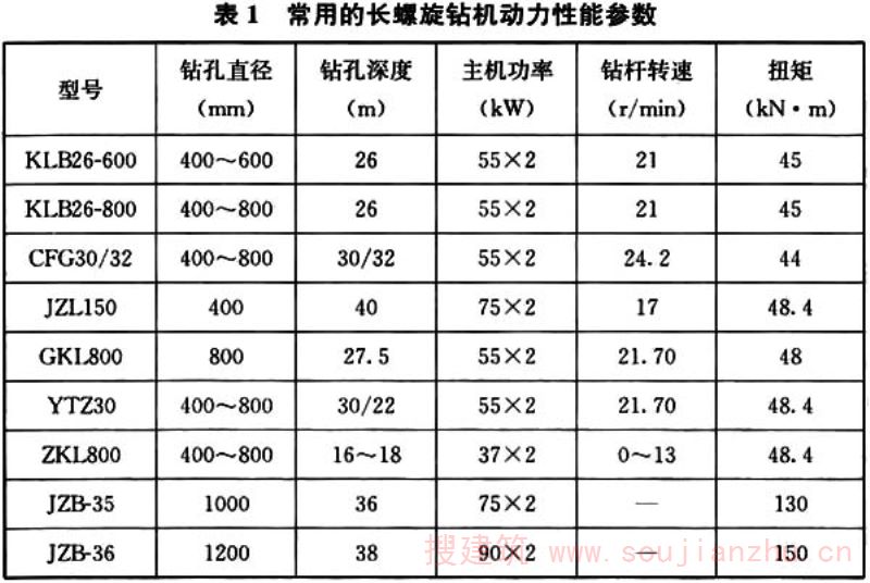 3.0.3 长螺旋钻孔压灌桩施工桩长目前受钻机塔架高度的限制,其设备施工能力制约其桩长不宜超过30m。钻机可更换不同直径的钻杆施工不同直径的长螺旋钻孔压灌桩,桩径直取400mm~1000mm。一般情况下,桩径小时桩长取大值,桩径大时桩长取小值。