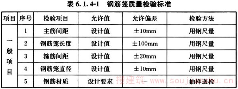 6.2.2 钢筋笼制作应对钢筋规格、焊条规格、品种、焊口规格、焊缝长度、焊缝外观和质量、钢筋保护层等进行检查。主筋和箍筋的材质以及制作偏差应符合本标准表6.1.4-1的规定。