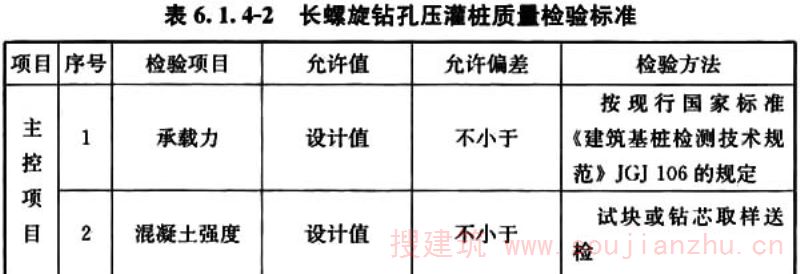 6.1.4 长螺旋钻孔压灌桩质量检验标准应符合表6.1.4-1和表6.1.4-2的规定。