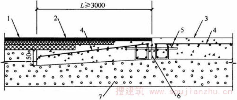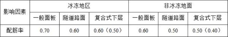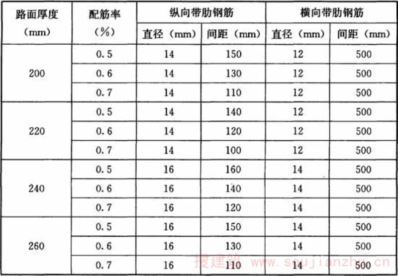 C.0.2连续配筋水泥混凝土路面中,纵向钢筋除承担荷载应力分布作用外,主要承担路面温缩应力、路面成型过程中干缩应力和路面与基层中的摩擦力,而横筋主要是用作连接纵筋的构造筋,数量并不包含在设计配筋率内。纵筋配筋率大小、间距与路表距离,直接影响路面横向裂缝的分布状况及路面冲断破损的可能性,国内外对纵筋配筋率的要求基本相近,即冰冻地区采用0.6%~0.8%(钢筋截面积与混凝土面板横截面积之比)。 日本规范对连续配筋混凝土路面结构的规定(表6)比较简单,N7类重载交通连续配筋混凝土路面厚度250mm可较普通混凝土路面厚度300mm减薄50mm。 表6日本连续配筋混凝土面板结构