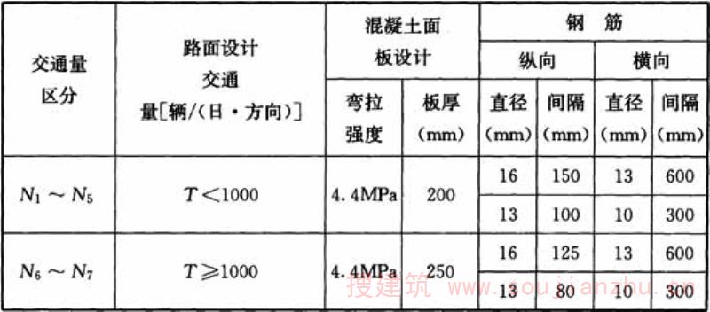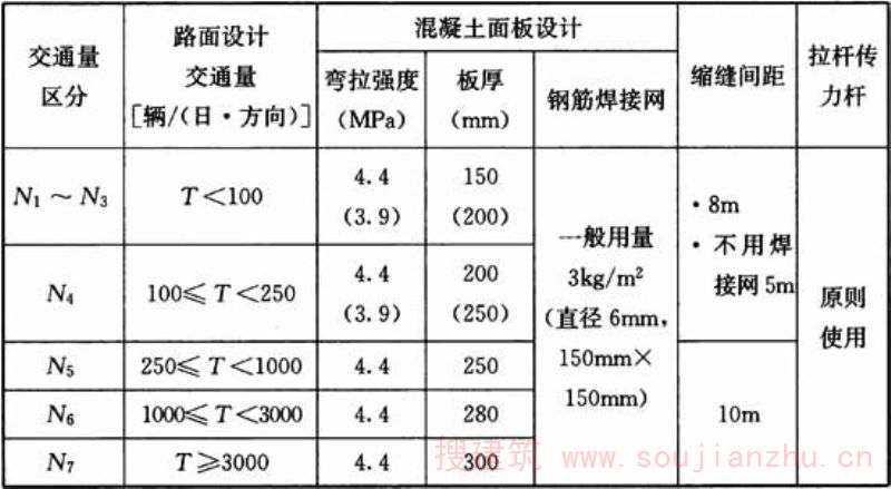 注:1表中板厚栏()内值为混凝土弯拉强度3.9MPa值。 2N5~N7不设钢筋焊接网时,缩缝间距6m。 1与我国普通混凝土路面采用素混凝土材料不同的是,日本普通混凝土中一般设置有钢筋焊接网,素混凝土只限用于工程较小的维修工程中; 2日本规范不同交通量(T<100~T≥3000)、不同面板厚度(150mm~300mm)焊接网的用量均为3kg/m2(直径6mm,间距150mm×150mm)。 在本次规程修订中,考虑到随着板厚的增加,面板钢筋网承受的荷载应力较大,成型收缩和温缩应力也较大,带肋钢筋直径随面板厚度的增加而适当加大更为合理,因此,在表C.0.1中,路面厚度150mm~240mm时采用直径6mm钢筋,路面厚度250mm~300mm时采用直径8mm,钢筋间距均采用150mm×150mm。 在2009年山西某高速公路水泥路面改造工程中,260mm厚水泥混凝土面板内,采用了直径8mm带肋钢筋焊接网,在重载条件下经三年行车,复合式路面无开裂病害,可见普通水泥混凝土路面中增设钢筋焊接网有明显的功能作用。