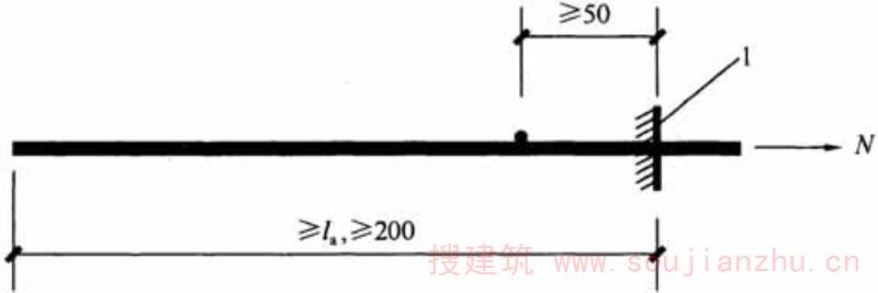 E.0.4 每批焊接网中应随机抽取一张焊接网,在纵横向钢筋上各截取2根试样,分别进行强度、伸长率和弯曲试验。每个试样应含有不少于一个焊接点,试样长度应保证夹具之间的距离不小于20倍试样直径,且不应小于180mm。对于并筋,非受拉的一根钢筋应在离交叉焊点约20mm处切断(图E.0.4)。
