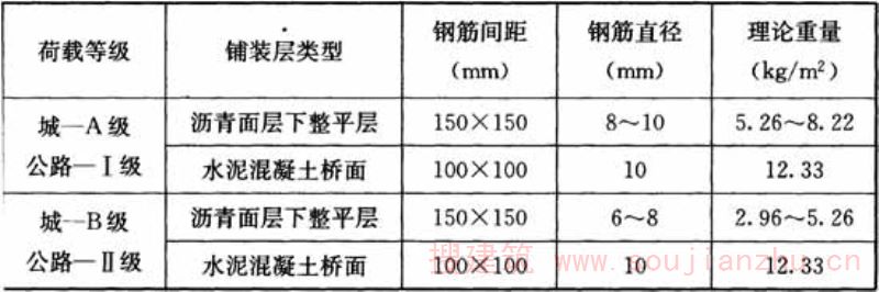 C.0.3表C.0.3中按现行公路、城市桥梁相关设计规范规定将2003年版规程中三种荷载等级调整为两种荷载等级,钢筋间距未作修改。 表C.0.3中城-A级(公路-Ⅰ级)和城-B级(公路-Ⅱ级)水泥混凝土桥面铺装层均采用10mm的钢筋直径,是为了满足《城市桥梁设计规范》CJJ11-2011第9.1.2条“2、铺装层内应配有钢筋网或钢筋焊接网,钢筋直径不应小于10mm”之规定。因此对2003年版规程中表B.0.1的钢筋直径8mm~10mm(城-A级)和8mm~9mm(城-B级)的规定作了修订。