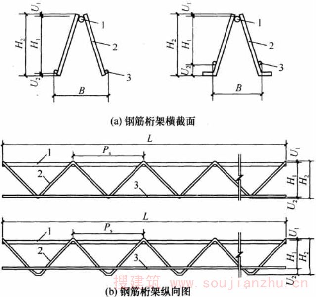 1-上弦钢筋;2-腹杆钢筋;3-下弦钢筋;U 1 -上伸出长度;U 2 -下伸出长度;L-桁架长度;B-设计宽度;H 1 -设计高度;H 2 -总高度;P s -节点间距