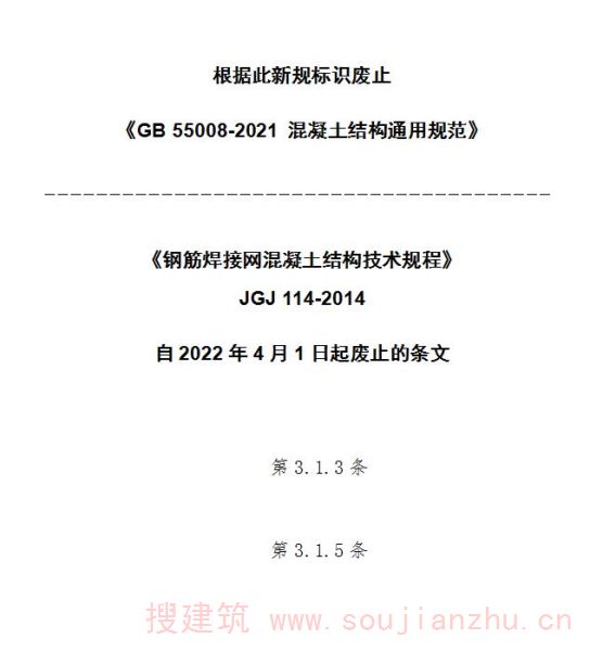 现批准《钢筋焊接网混凝土结构技术规程》为行业标准,编号为JGJ 114-2014,自2014年10月1日起实施。其中,第3.1.3、3.1.5条为强制性条文,必须严格执行。原《钢筋焊接网混凝土结构技术规程》JGJ 114-2003同时废止。