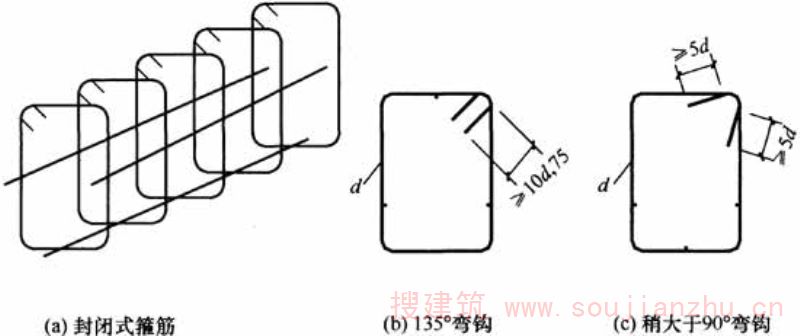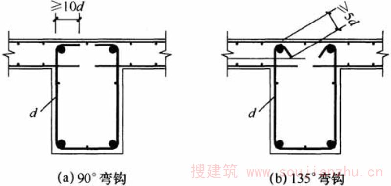 B.0.1 除边梁外,整体现浇梁板结构中的梁,当采用U形开口焊接箍筋笼时,应符合本规程第5.1.37条的相应规定,且箍筋宜靠近构件周边位置,开口箍的顶部应布置通长、连续的焊接网。带肋钢筋箍筋笼可采用90°弯钩或135°弯钩(图B.0.1)的形式。