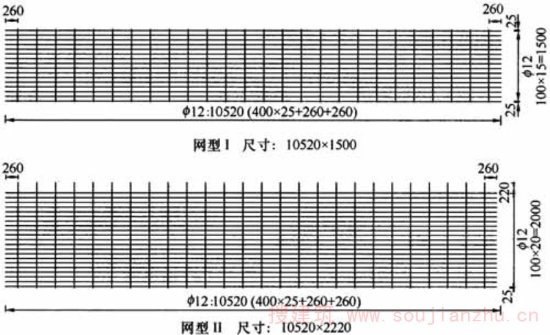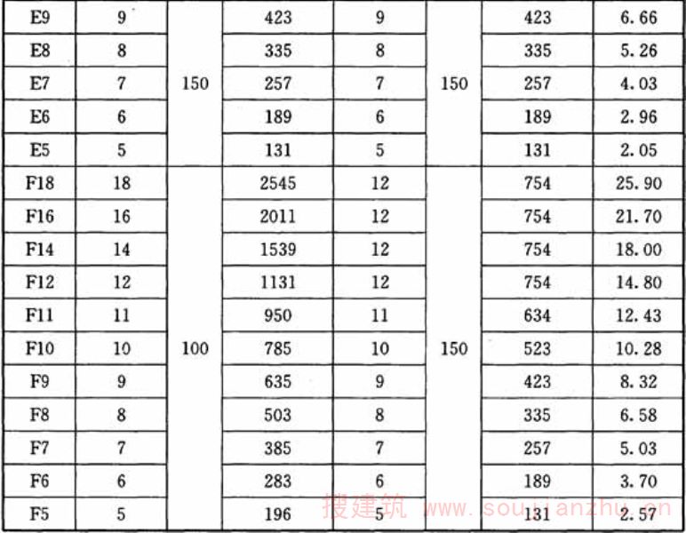 定型钢筋焊接网是一种通用性较强的焊接网,当网片外形尺寸确定后,可提前在工厂批量预制。在国外焊接网应用比较发达的国家,焊网厂均有大量提前预制的各种型号网片储存、待用。 本附录表A给出了6种网格尺寸、11种直径的定型钢筋焊接网。直径14mm、16mm、18mm仅适用于热轧400MPa级和500MPa级带肋钢筋。定型网今后的发展方向是争取网片尺寸定型,只有这样,网片才能大规模、高度自动化、成批生产,降低成本。表中给出3种正方形网格和3种矩形网格,除国际上常用的200mm×200mm及100mm×100mm外,又结合工程需要增加了150mm×150mm等其他网格尺寸。最近国内有的焊网厂又增加了以25mm为模数的125mm、175mm纵筋间距尺寸。定型焊接网在两个方向上的钢筋间距和直径可以不同,但在同一方向上的钢筋宜有相同的牌号、间距、直径及长度。在国外的工程应用中有时纵筋为较粗直径的热轧带肋钢筋而横筋为较细直径的冷轧带肋钢筋,这样,当两个方向直径相差较大时,可减少对较细直径焊接烧伤的影响。目前,国内定型焊接网的长度和宽度主要由设计人员根据具体工程确定。本附录表A主要是提供一个工程上所用的焊接网的钢筋直径范围及相应的网格尺寸、包括每米钢筋面积和单位面积重量等供设计人员参考。 焊接网的代号是在纵向钢筋的直径数值前面冠以代表不同网格尺寸的英文大写字母构成,其中,A、B、D型考虑了与国际上有些国家的应用习惯相一致。表A中给出的重量是根据纵、横向钢筋按表中的相应间距均匀布置时,计算的理论重量,工程应用时尚应根据网端钢筋伸出的实际长度计算网重。