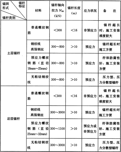 E.0.1 锚杆材料可根据锚固工程性质、锚固部位和工程规模等因素,选择高强度、低松弛的普通钢筋、预应力螺纹钢筋、预应力钢丝或钢绞线。
