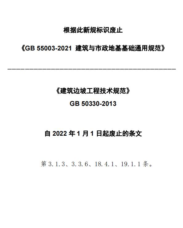 现批准《建筑边坡工程技术规范》为国家标准,编号为GB 50330-2013,自2014年6月1日起实施。其中,第3.1.3、3.3.6、18.4.1、19.1.1条为强制性条文,必须严格执行。原《建筑边坡工程技术规范》GB 50330-2002同时废止。