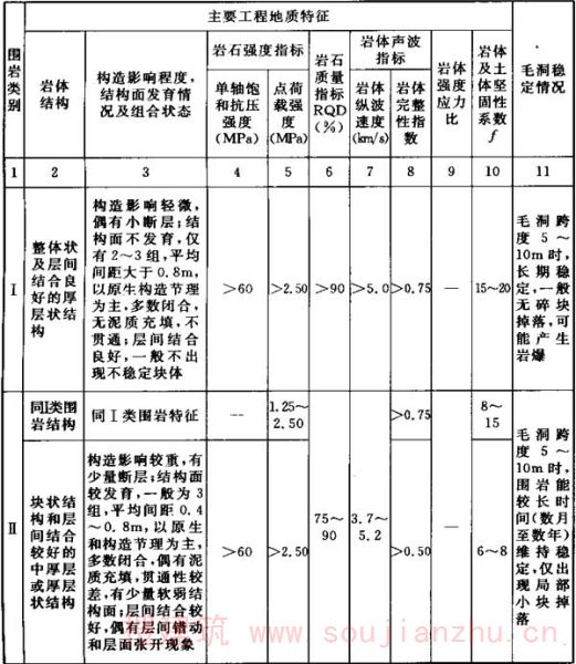 4 一般条件下,确定围岩类别时,应以岩石单轴饱和抗压强度为准;当洞跨小于5m,服务年限小于10年的工程,确定围岩类别时,可用点荷载强度指标代替岩块单轴饱和抗压强度指标,可不做岩体声波指标测试。