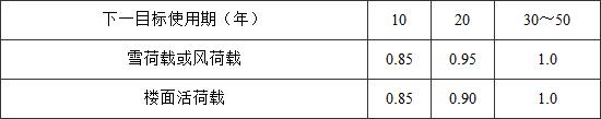 J.0.10 对本标准第J.0.1条规定的各种情况进行加固设计验算时,其基本雪压值、基本风压值和楼面活荷载的标准值,除应按现行国家标准《建筑结构荷载规范》GB 50009的规定采用外,尚应按下一目标使用期,乘以表J.0.10的修正系数k a 予以修正。