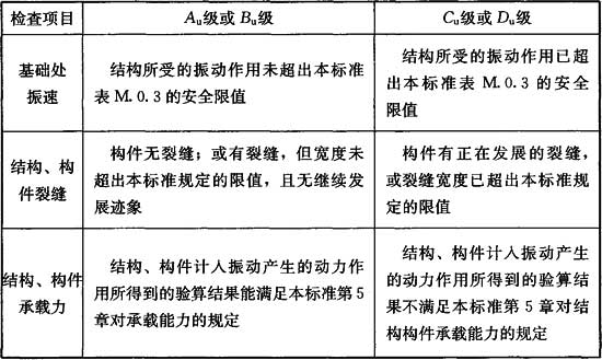 M.0.4 当建筑结构的振动作用虽小于本标准表M.0.3的限值,但已引起使用者对结构安全的担心时,应对建筑结构产生的裂缝和其他损伤进行检查;对振动作用明显的梁、板构件,应根据振动对结构构件的作用进行验算分析。结构考虑振动影响的安全性等级评定可按表M.0.4进行。