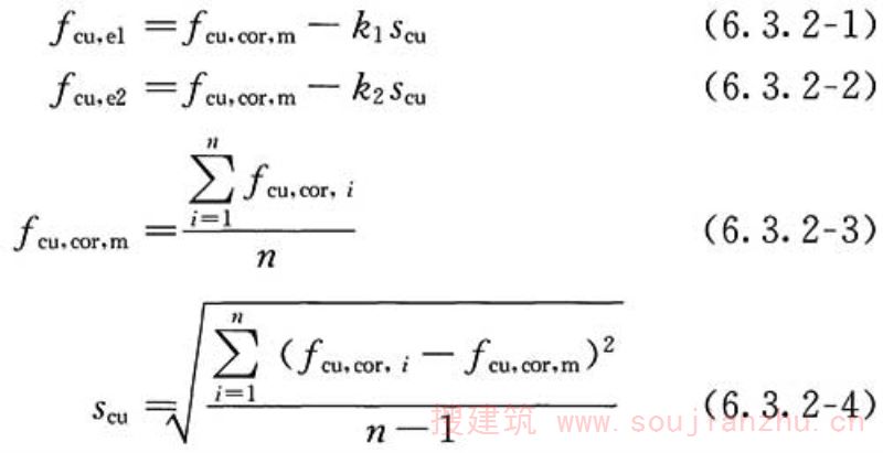 6.3.2本条对检测批混凝土抗压强度推定值的确定进行了规定: 1检测批混凝土抗压强度的推定区间的确定方法。由于抽样检测必然存在着抽样不确定性,给出确定的推定值必然与检测批混凝土强度值的真值存在偏差,因此给出一个推定区间更为合理。推定区间是对检测批混凝土相应强度真值的估计区间。按此规定给出的推定区间应符合现行国家标准《建筑工程施工质量验收统一标准》GB50300的相关规定。 2对推定区间进行控制,包括推定区间的置信度、上限值与下限值之差值△k,△k=(k2—k1)scu。减小样本的标准差,合理确定芯样试件的数量是满足推定区间要求的两个因素。 3以检测批混凝土抗压强度推定区间的上限值作为混凝土工程施工质量的评定界限,应符合现行国家标准《建筑工程施工质量验收统一标准》GB50300关于错判概率不大于0.05的规定;芯样试件抗压强度值一般不会高出结构或构件混凝土的实际强度,一般略低于实际强度。