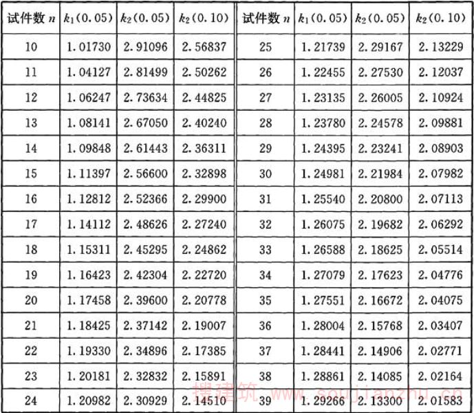 A.0.1 k 1 宜为置信度为0.90,错判概率为0.05条件下的限值系数;k 2 宜为置信度为0.90,漏判概率为0.05条件下的限值系数。当采用小直径芯样试件时,k 1 可为置信度为0.85,错判概率为0.05条件下的限值系数;k 2 可为置信度为0.85,漏判概率为0.10条件下的限值系数。