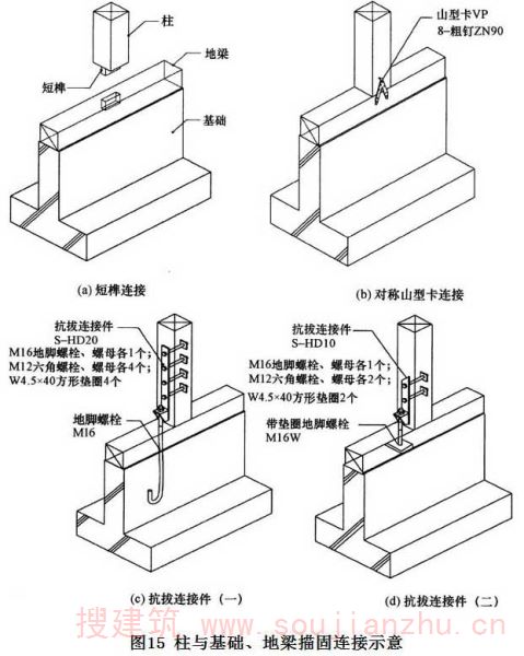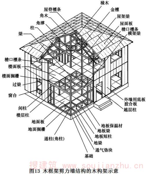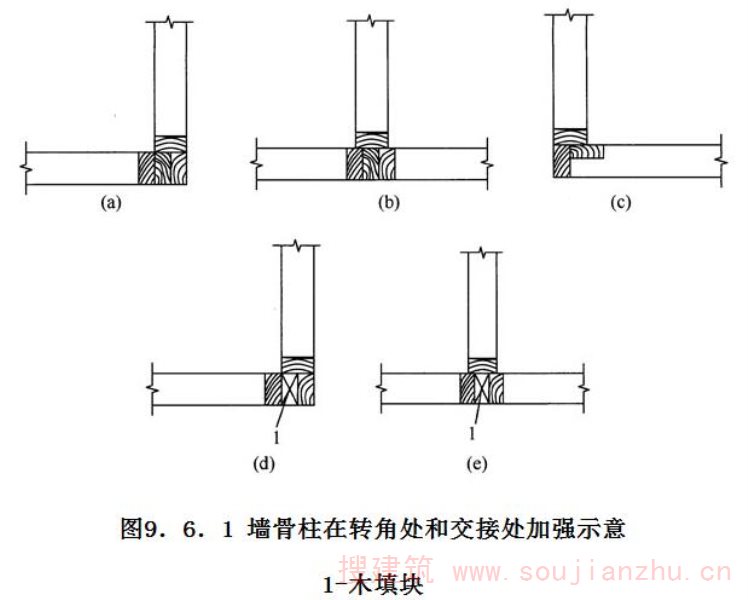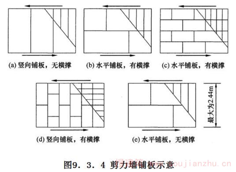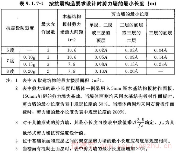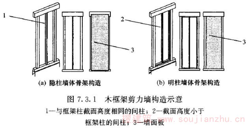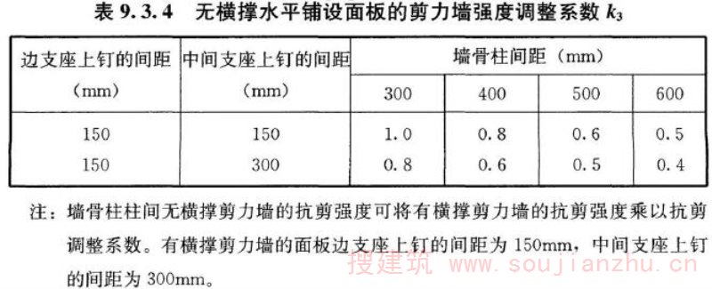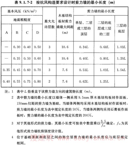 4 本条规定的木框架剪力墙的抗剪强度设计值是针对日本JAS标准规定的结构用胶合板(其性能与国外的结构用胶合板基本相同)为面材的剪力墙确定的。