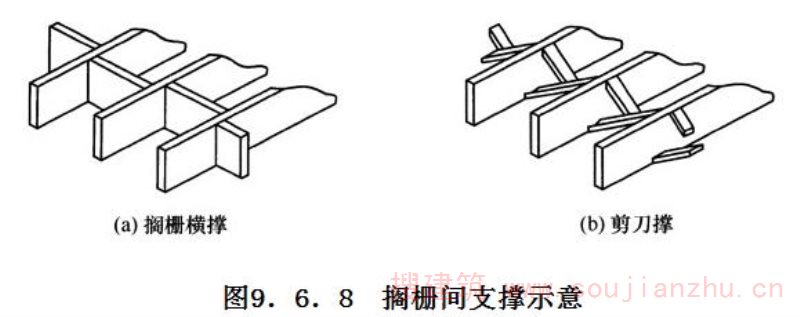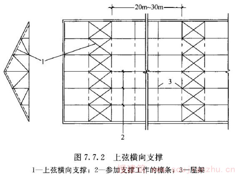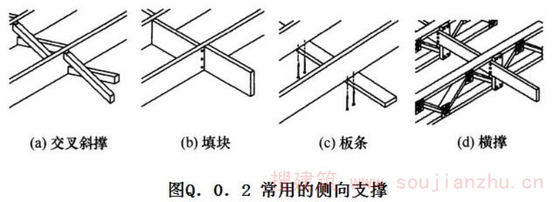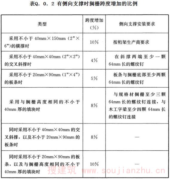 Q.0.2 当搁栅之间有交叉斜撑、板条、填块或横撑等侧向支撑(图Q.0.2), 且侧向支撑之间的间距不应大于2m时,由振动控制的搁栅跨度l可按表Q.0.2 中规定的比例增加。