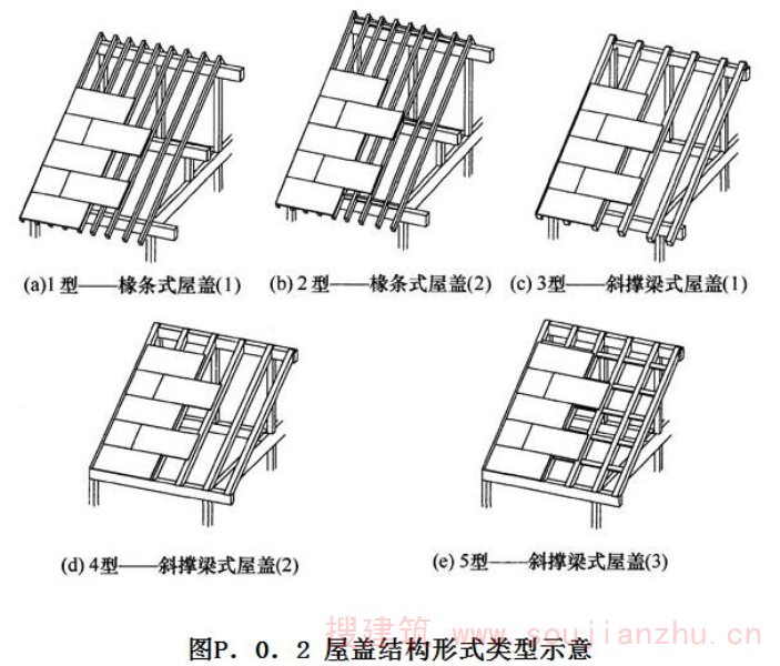 P.0.2 采用木基结构板材的木框架剪力墙结构屋盖抗剪强度设计值应根据屋盖的构造类型(图P.0.2), 按表P.0.2 的规定取值。