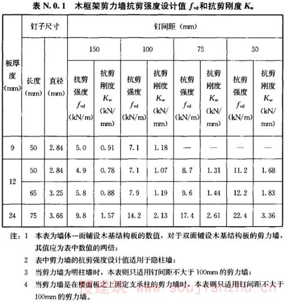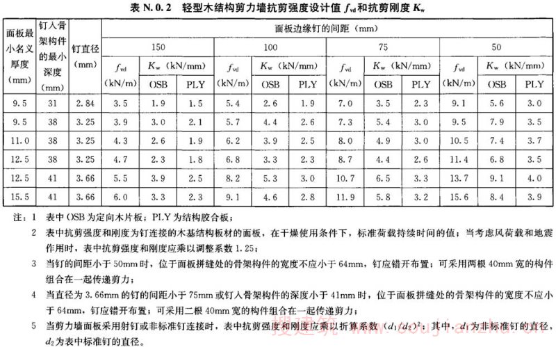 N.0.2 单面采用木基结构板材的轻型木结构剪力墙的抗剪强度设计值和抗剪刚度应按表N.0.2的规定取值。
