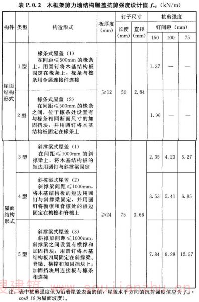 P.0.1、P.0.2 木框架剪力墙结构中,楼盖、屋盖抗剪强度设计值的确定方法与附录N中第N.0.1条木框架剪力墙抗剪强度设计值确定方法相同。由于屋盖的构成形式较多,其中部分形式的屋盖是通过实验确定的。