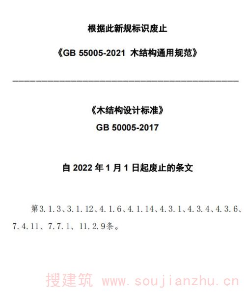 现批准《木结构设计标准》为国家标准,编号为GB 50005-2017,自2018年8月1日起实施。其中,第3.1.3、3.1.12、4.1.6、4.1.14、4.3.1、4.3.4、4.3.6、7.4.11、7.7.1、11.2.9条为强制性条文,必须严格执行。原国家标准《木结构设计规范》GB 50005-2003同时废止。