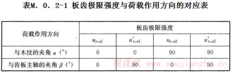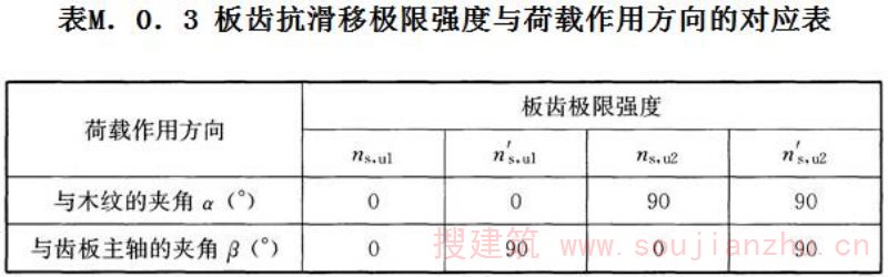 M.0.5 齿板抗剪强度设计值的确定应分别按本标准第M.0.1条确定的3个齿板抗剪极限强度校正试验值中2个最小值的平均值除以1.75选取。若齿板主轴与荷载方向夹角β与试验方法的规定不同时,齿板抗剪强度设计值应按线性插值法确定。
