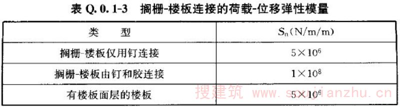 S n ——搁栅-楼板连接的荷载-位移弹性模量(N/m/m),按表Q.0.1-3 的规定取值;