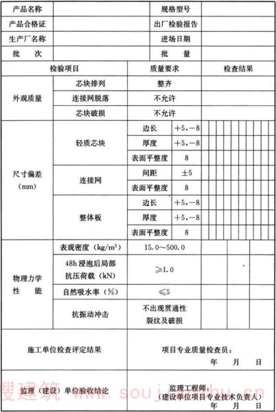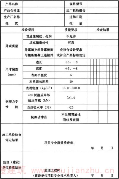 E.1.1表E.1.1-1列出了填充管、填充棒进场时应检验项目及相应质量要求。表E.1.1-2列出了填充箱、填充块进场时应检验项目及相应质量要求。表E.1.1-3列出了填充板进场时应检验项目及相应质量要求。各种类型的填充体进场时,施工项目的专业质量检验员和监理工程师共同按该验收记录表的要求进行验收及记录检测结果。产品合格证、出厂检验报告及进场检验报告应作为本表的附件。