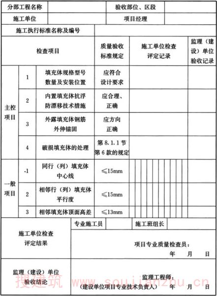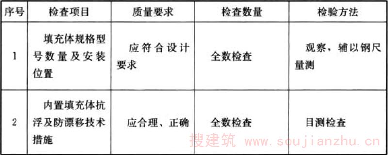E.2.1表E.2.1列出了填充体安装检验批验收应检查的项目及相应质量要求。内置填充体抗浮措施、外露填充体顶板和底板钢筋外伸锚固、施工中局部破损的填充体的处理等是保证现浇混凝土空心楼盖结构截面成型准确及结构安全可靠的重要项目,故将其归入质量验收主控项目。填充体安装定位、抗浮及防水平漂移措施完工后,经施工班组自检与交接检,专业施工员随班检查,项目专职质量检验员检查合格后,由项目专职质量检验员填写该记录表,并向项目监理机构(或建设单位项目管理机构)报验,由项目监理工程师(建设单位项目技术负责人)组织项目专业质量检验员等共同进行验收。按照现行建筑法规的有关规定,参加质量检查验收有关各方对验收结果真实有效应承担各自相应的责任。