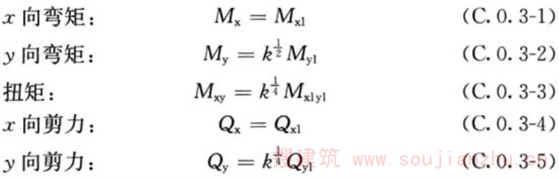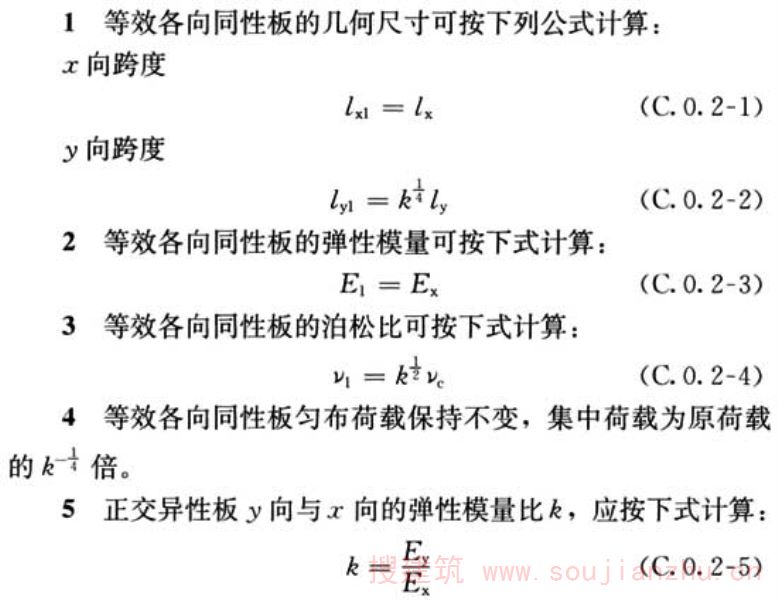 C.0.3 计算出尺寸为l x1 ×l y1 、弹性模量为E 1 、泊松比为v 1 的各向同性板在相应等效荷载作用下的内力和变形,原正交异性板各对应点变形不变,内力应按下列公式计算:
