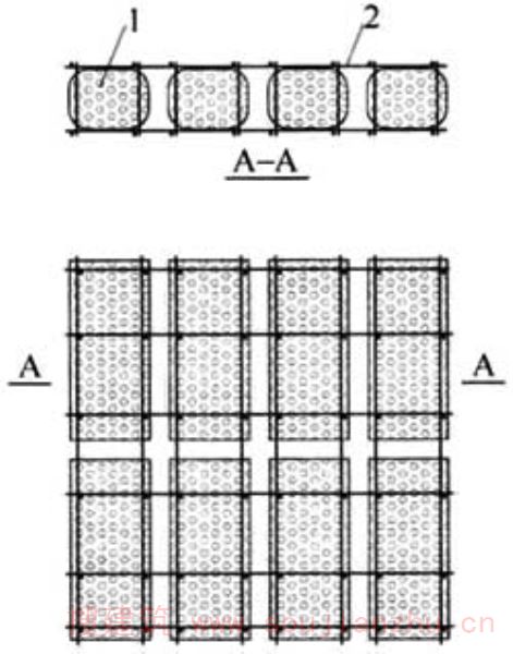 填充板是通过钢丝连接网将轻质芯块连为一体形成的网格状填充板,填充板的构造见图1,现场浇筑混凝土后与混凝土成为整体。