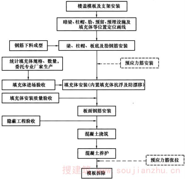 D.0.1 现浇混凝土空心楼盖可按图D.0.1流程施工: