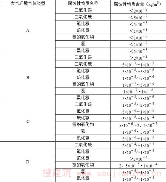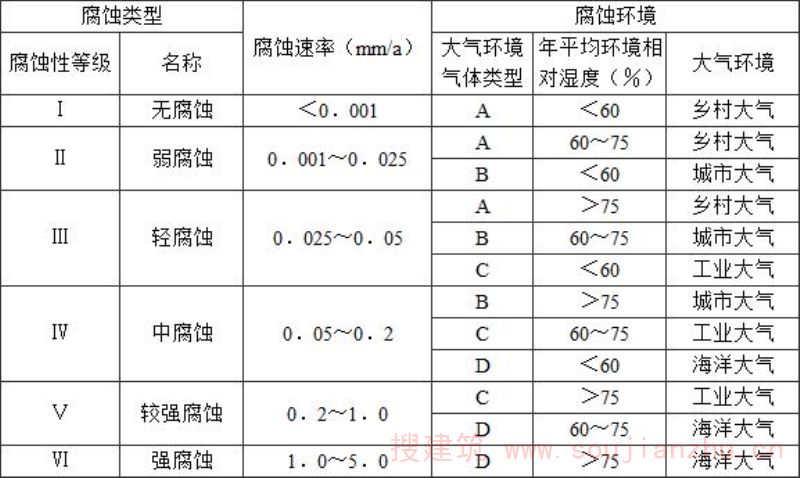 3.1.2由于大气环境中所含的腐蚀性物质的成分、浓度、相对湿度是影响钢结构腐蚀的关键因素。本条根据《大气环境腐蚀性分类》GB/T15957,按影响钢结构腐蚀的主要气体成分及其含量,将环境气体分为A、B、C、D四种类型。大气相对湿度(RH)类型分为干燥型(RH<60%)、普通型(RH=60%-75%)、潮湿型(RH>75%)。根据碳钢在不同大气环境下暴露第一年的腐蚀速率(mm/a),将腐蚀环境类型分为六大类。 进行建筑钢结构防腐蚀设计时,可按建筑钢结构所处位置的大气环境和年平均环境相对湿度确定大气环境腐蚀性等级。当大气环境不易划分时,大气环境腐蚀性等级应由设计进行确定。 在特殊场合与额外腐蚀负荷作用下,应将腐蚀类型提高等级。例如:①风沙大的地区,因风携带颗粒(沙子等)使钢结构发生磨蚀的情况;②钢结构上用于(人或车辆)通行或有机械重负载并定期移动的表面;③经常有吸潮性物质沉积于钢结构表面的情况。 考虑到处于潮湿状态或不可避免结露部位的标准应相应提高,对如厕浴间等类似的局部环境将大气相对湿度按RH>75%考虑。
