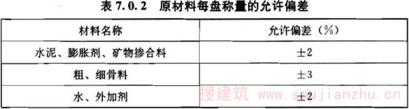 7.0.2 补偿收缩混凝土的各种原材料应采用专用计量设备进行准确计量。计量设备应定期校验,使用前应进行零点校核。原材料每盘称量的允许偏差应符合表7.0.2的规定。
