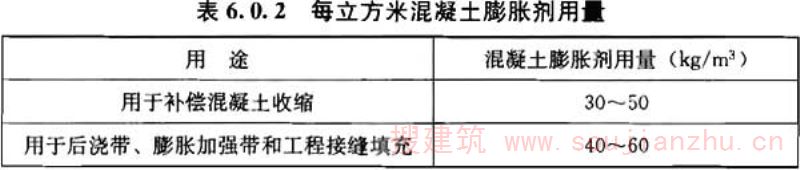 6.0.2 膨胀剂掺量应根据设计要求的限制膨胀率,并应采用实际工程使用的材料,经过混凝土配合比试验后确定。配合比试验的限制膨胀率值应比设计值高0.005%,试验时,每立方米混凝土膨胀剂用量可按照表6.0.2选取。