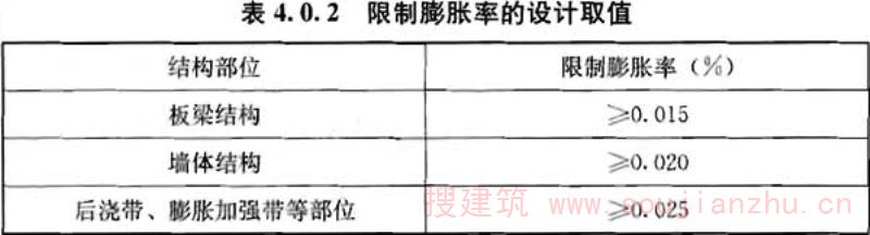 2 限制膨胀率的设计取值应符合表4.0.2的规定。使用限制膨胀率大于0.060%的混凝土时,应预先进行试验研究。