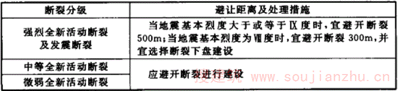 3.1.2对影响站址区构造稳定的全新活动断裂,特别是强烈全新活动断裂和发震断裂,站址布置时必须采取避让措施。活动断裂对站址稳定性的影响主要在于断裂位错对建筑物的破坏性影响。由于地质内营力作用,断裂位错对人类来说是无法抗拒的,难以采取任何工程补救或抗拒措施,对建筑物的破坏往往是致命的,因此必须予以避让。 滑坡、崩塌、泥石流、地裂缝、地面塌陷等不良地质作用的影响主要体现在对场地稳定性的影响,当然,不良地质作用的发育程度不同对场地稳定性影响的程度也不同。当其发育程度和规模一般或轻微时,也可以采取一定的工程措施予以处理。但对可能发生严重的不良地质作用的场地,往往难以采取合理的工程处理措施,或处理后仍对工程安全造成隐患,或处理费用极高,因此,工程选址时必须予以避让。