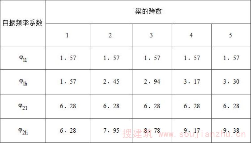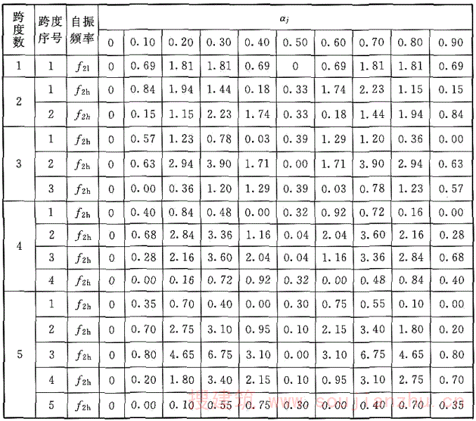 注:α j 为集中质量离左边支座距离x与梁的跨度l 0 之比,对于中间跨内集中质量的x值,仍为集中质量离本跨左边支座的距离。